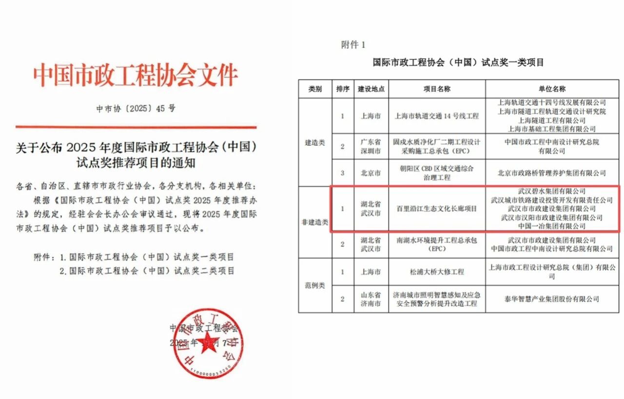 近日,從中國(guó)市政工程協(xié)會(huì)2025年年會(huì)上傳來(lái)喜訊:由中國(guó)一冶參與承建的“百里沿江生態(tài)文化長(zhǎng)廊”項(xiàng)目(包含青山江灘、漢陽(yáng)江灘、青山濕地、月亮灣陽(yáng)臺(tái)、中華路陽(yáng)臺(tái)等),憑借其在生態(tài)修復(fù)、城市更新與可持續(xù)發(fā)展方面的卓越成就,榮膺國(guó)際市政工程協(xié)會(huì)中國(guó)試點(diǎn)獎(jiǎng)一類項(xiàng)目。國(guó)際市政工程協(xié)會(huì)主席維勒·阿拉蒂波拉現(xiàn)場(chǎng)頒獎(jiǎng),標(biāo)志著武漢的這一“生態(tài)答卷”獲得國(guó)際頂尖專業(yè)組織的高度認(rèn)可。